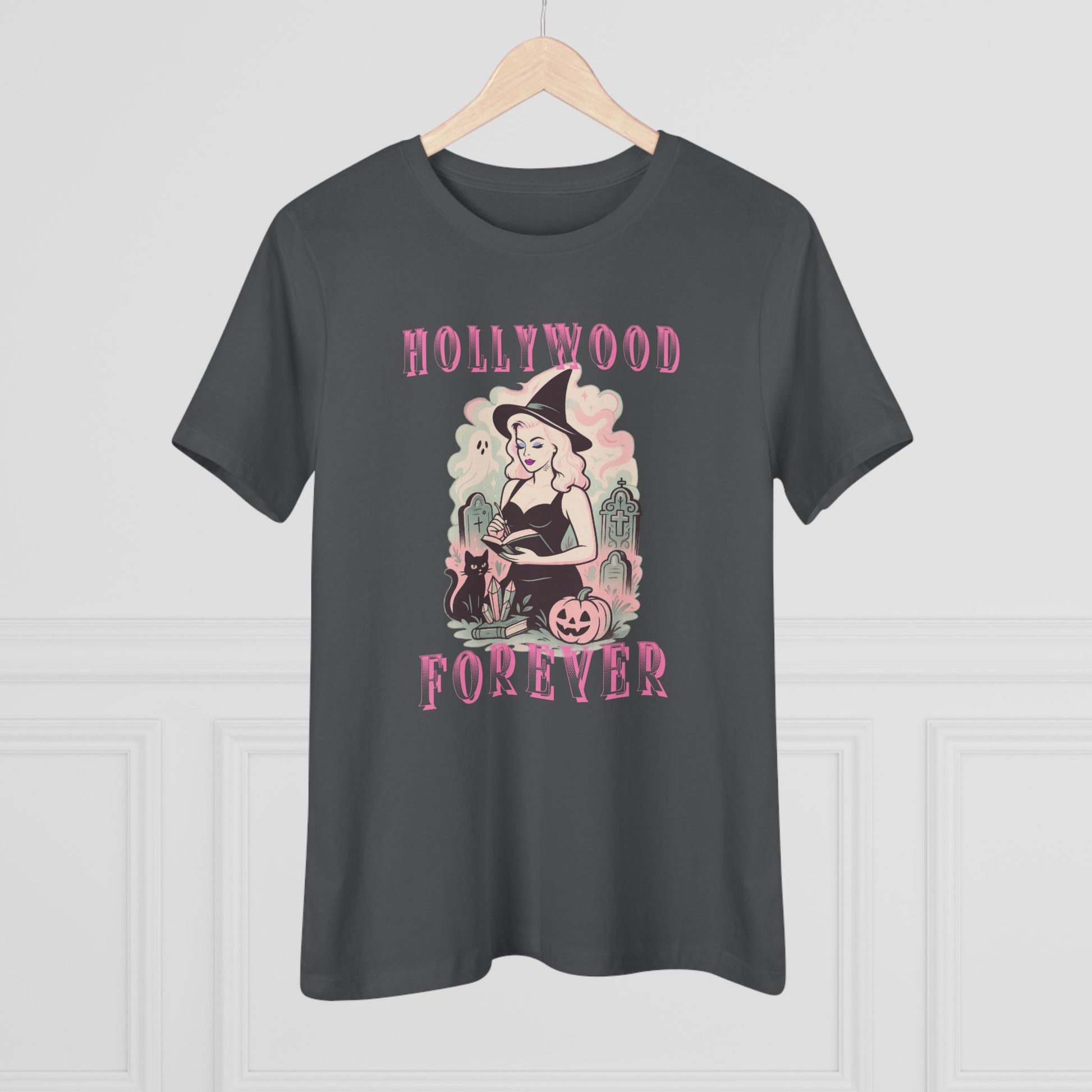 Glamour never dies. The Hollywood Forever Tee reimagines Marilyn Monroe with our spooky twist — witch hat, graveyard vibes, and pastel pink magic. Surrounded by headstones, crystals, pumpkins, and a black cat, this design brings vintage Hollywood allure into the afterlife.